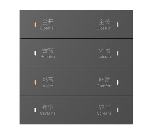 4联8键智能面板,金属边框,(锌合金)金属按键,圆点指示灯可透光,按键字体/图案标识雕刻不支持透光