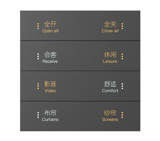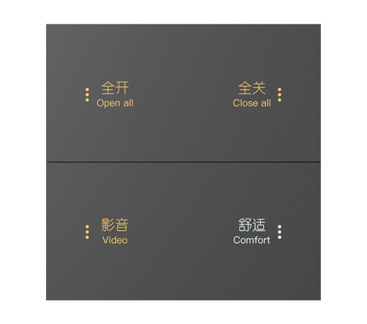4联8键智能面板,金属边框,(铝合金)金属按键,金属按键可选择圆点/字体/图案标识进行镂空,支持透光