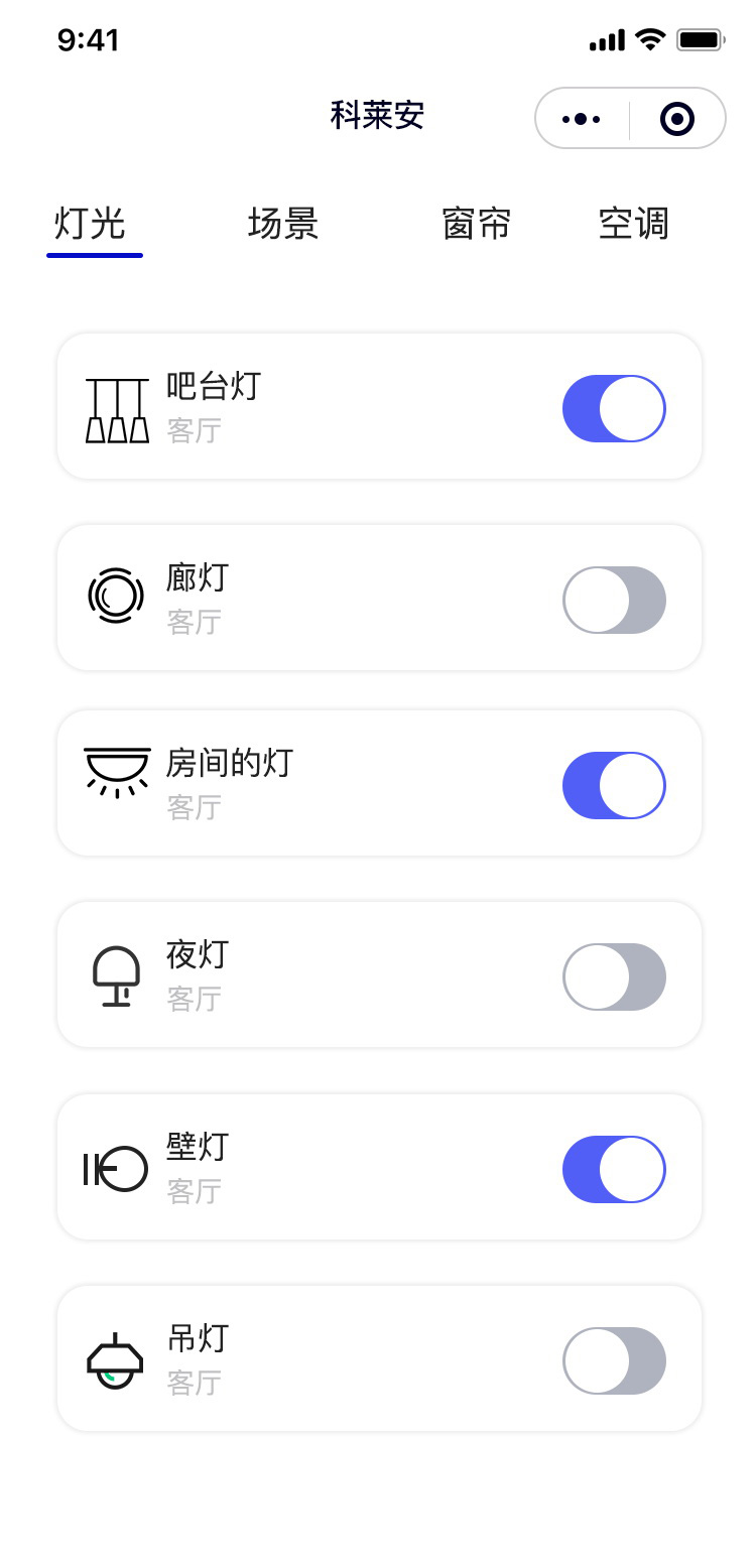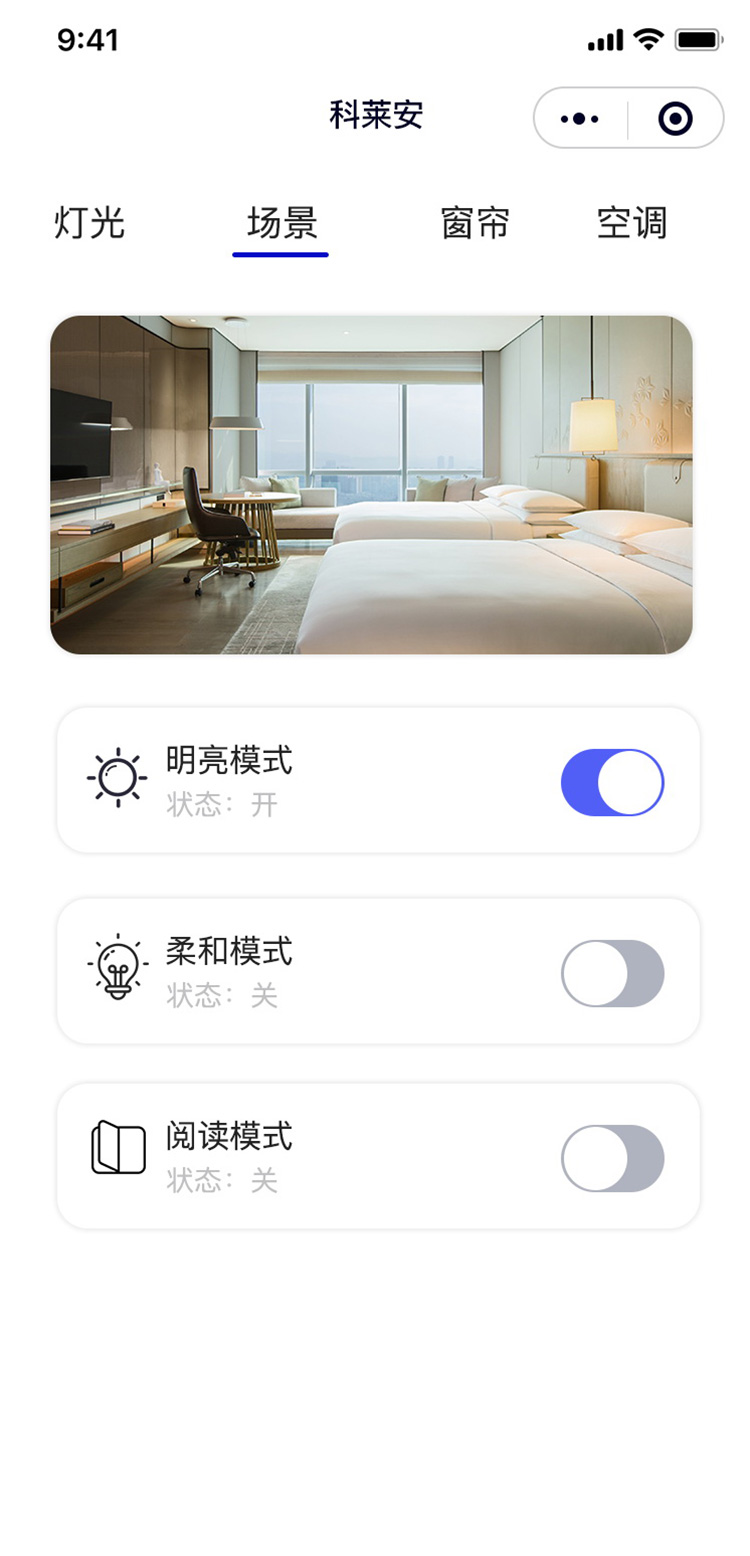 使用该小程序将使你在居住中变得更加舒适和愉快。客控系统为你提供了完整远程客控系统,包括了灯光、窗帘、空调、多媒体等等。你可以根据你的意愿轻松的改变他们。