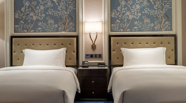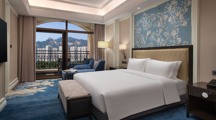 酒店共配备343间豪华客房及套房,面积从45㎡至360㎡不等,配备65英寸智能电视及欧式现代家居,深浸泡式浴缸及干湿分离的淋浴间、悬浮式面盆以及高档卫浴用品。