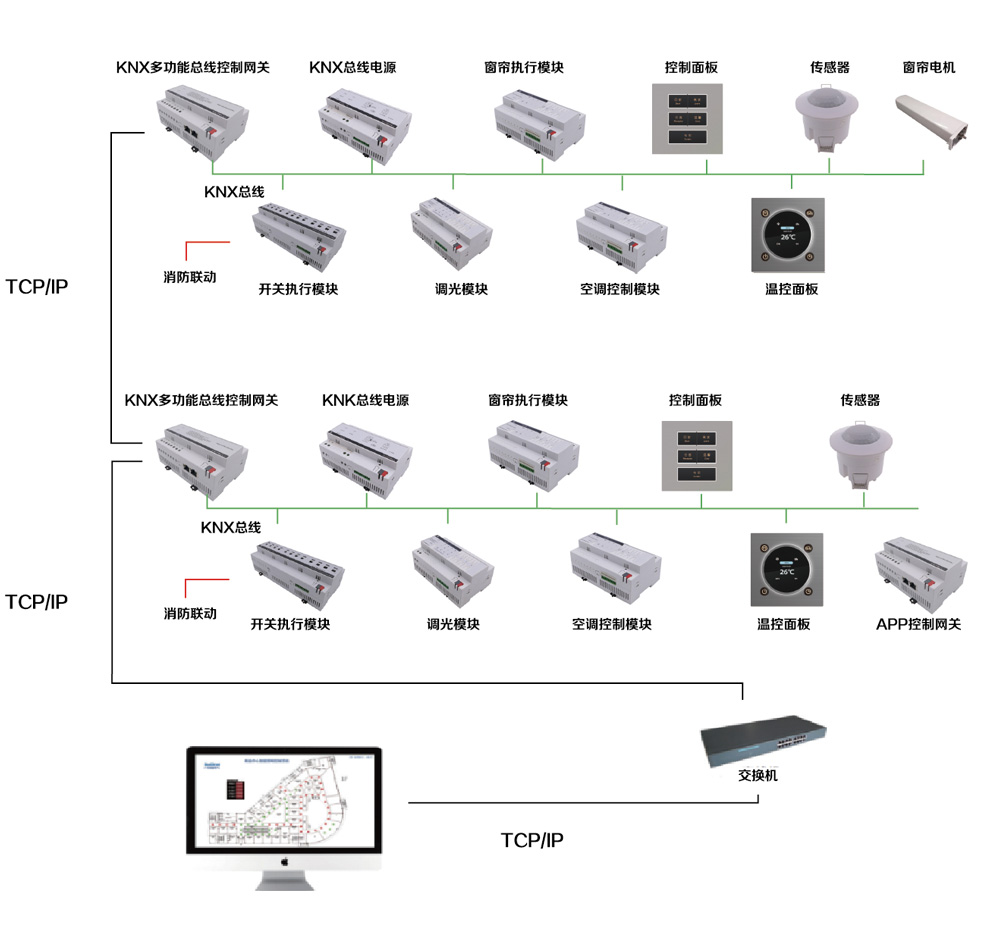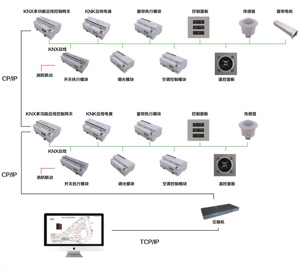 科菜安智能照明系统采用KNX总线通信协议技术。KNX技术是汇集超过20年KNX技术前身如欧洲安装总线(EIB)、欧洲住宅系统(EHS)及Bati-BUS的知识所得经验的结果。该技术是一种高稳定性的总线通信技术,它主要利用国际通用的KNX总线来实现对灯光、电器以及办公设备等的智能控制。KLA-BUS技术的解决方案包括如下领域的应用:照明控制,遮光和百叶窗控制,音频和视频的控制,供暖、通风和空气控制,能源管理。保安和安全,KNX自动化以及网络与电气设备间的通信。KNX通过产品确保产品的互操作性和交互性,支持多种配置和通信介质,所以KNX完全可以与其他系统连结,但它又独立于任何硬件或软件技术。